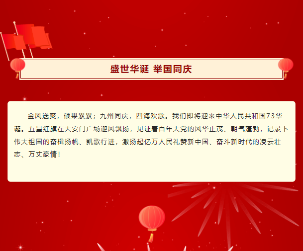 【概要描述】金风送爽,硕果累累;九州同庆,四海欢歌。我们即将迎来中华人民共和国73华诞。